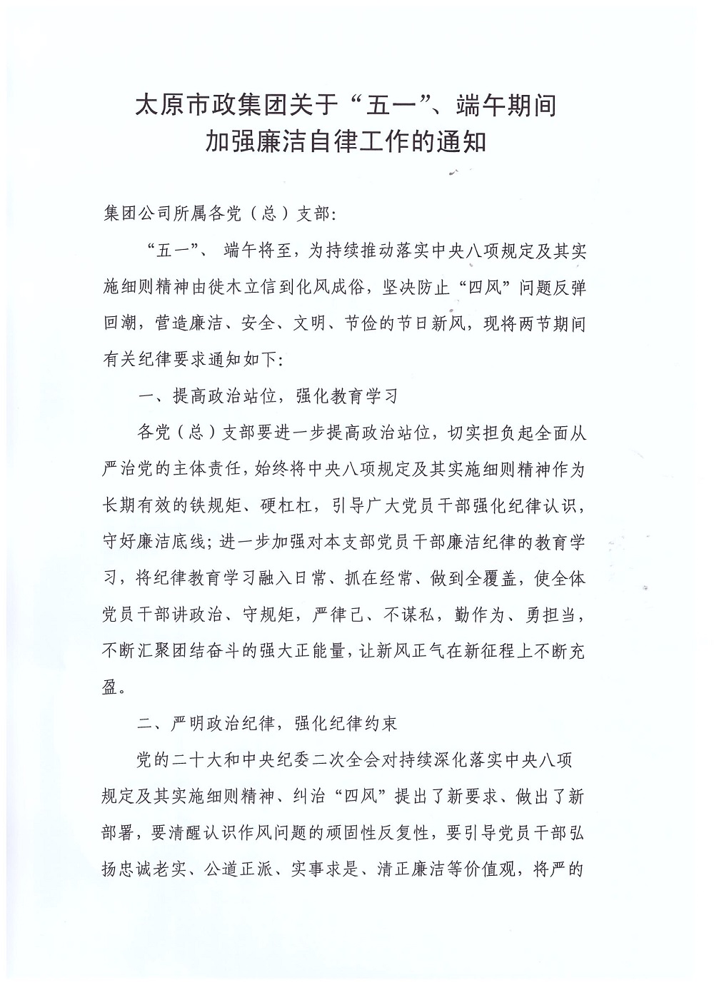 太原市政集團(tuán)關(guān)于“五一”、端午期間加強廉潔自律工作的通知