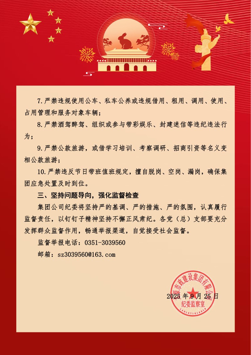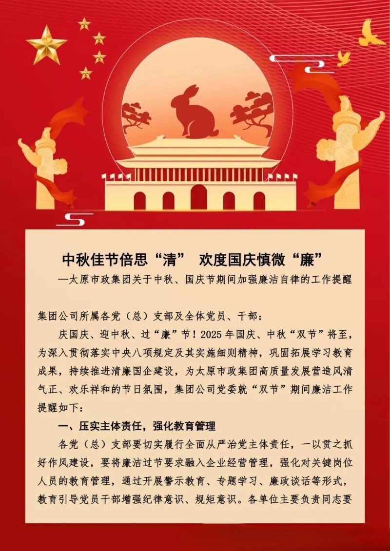 太原市政集團關于中秋、國慶節(jié)期間加強廉潔自律的工作提醒