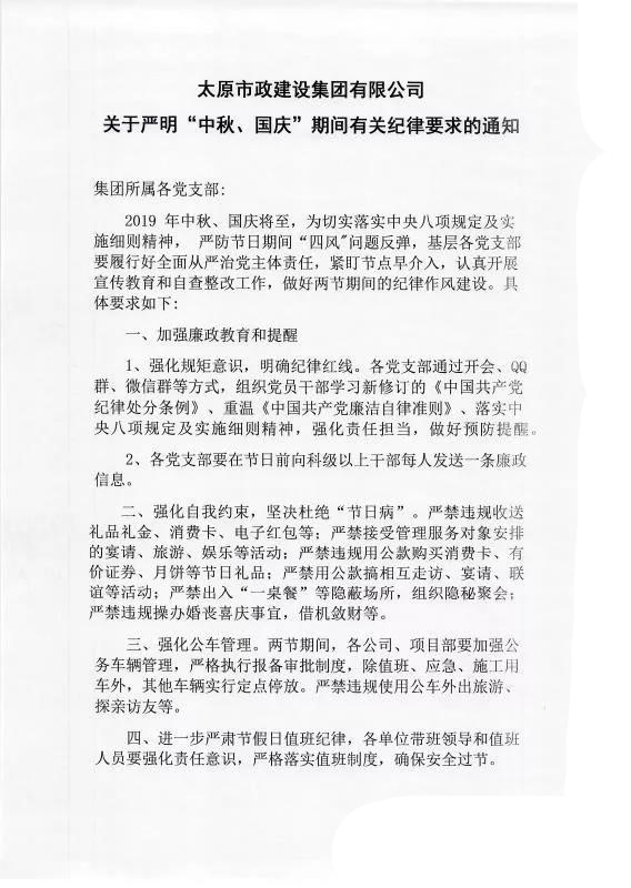太原市政建設(shè)集團(tuán)有限公司關(guān)于嚴(yán)明“中秋、國慶”期間有關(guān)紀(jì)律要求的通知