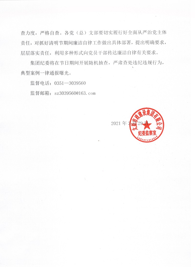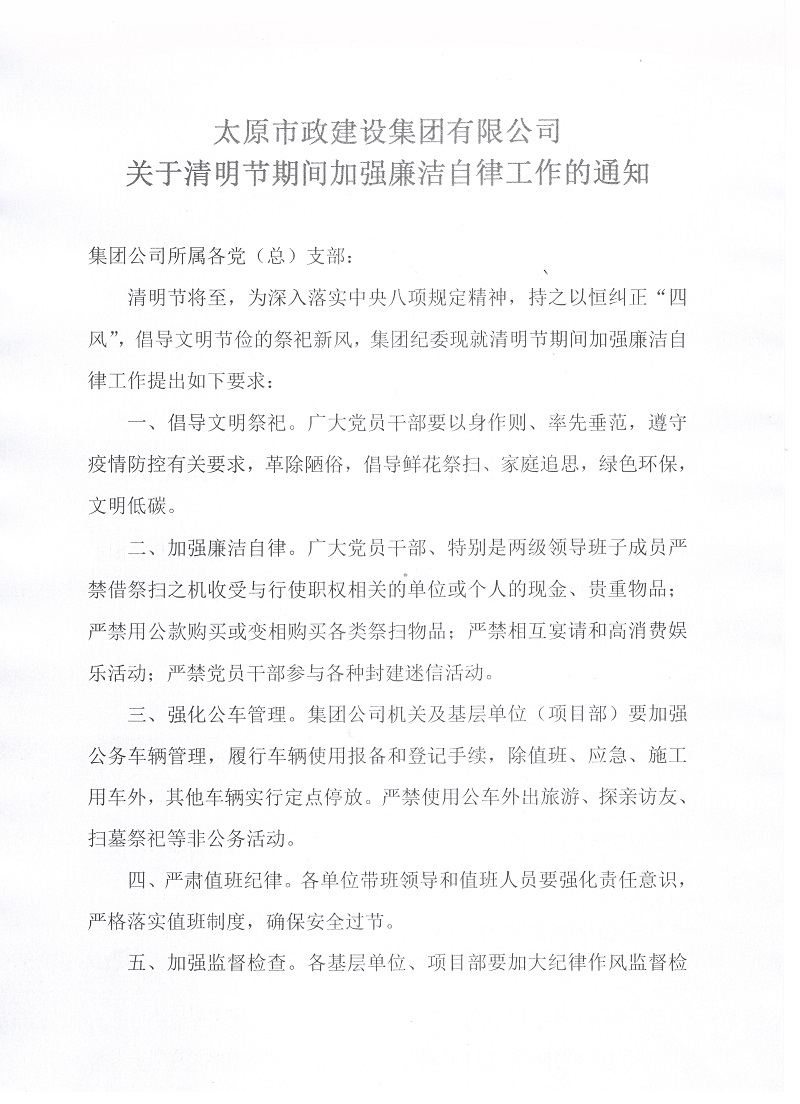 太原市政建設集團有限公司關于清明節(jié)期間加強廉潔自律工作的通知