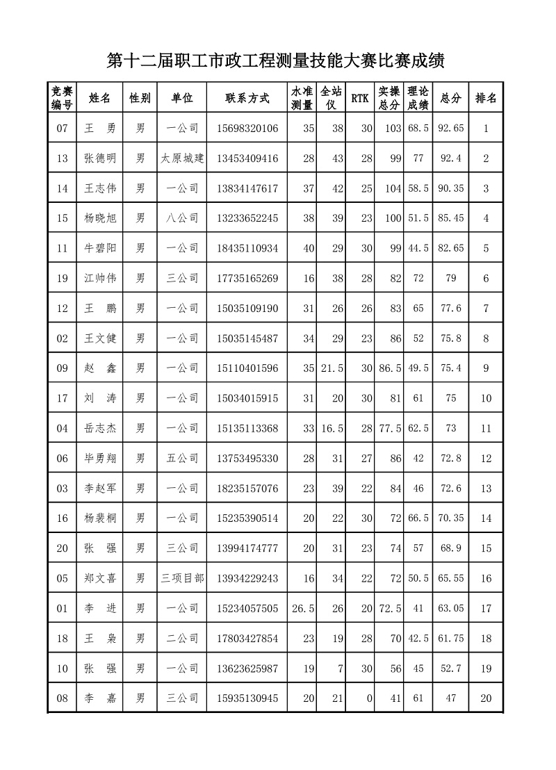 又訊:本屆市政工程測量放線員技能大賽,共有94名選手報名參賽,大賽分為理論和實操兩部分。理論考試獲得前20名的選手進(jìn)入實際操作比賽。經(jīng)過一天的角逐,裁判組根據(jù)選手現(xiàn)場操作情況進(jìn)行綜合評判、打分。每位選手最終成績由30%的理論成績和70%的實操成績組成,最終決出前16名,其中榮獲前6名的選手將報請市勞動競賽委員會給予記功表彰,7-16名的選手頒發(fā)“優(yōu)秀選手”榮譽證書。