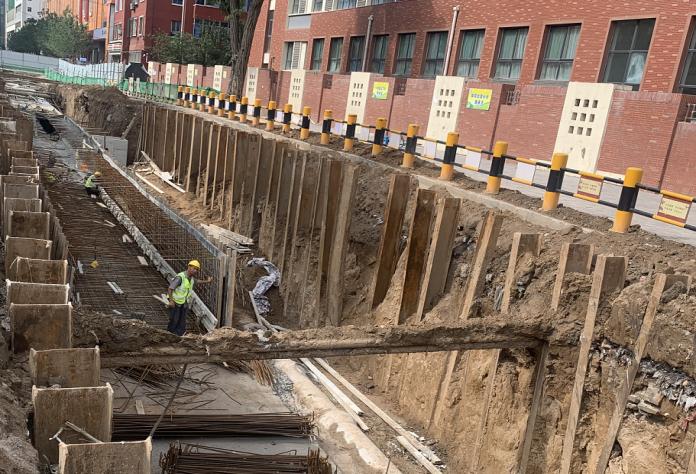 施工中,面對無法開展大面積施工,且施工路段無放坡條件等難題,項(xiàng)目部迅速行動、倒排工期,將工期分解到周、計(jì)劃到天,各項(xiàng)安排落到實(shí)處,明確全員崗位職責(zé),組織機(jī)械和人工齊上陣,同時(shí)展開多個作業(yè)面,加速推進(jìn)工程進(jìn)展。在黑土巷中橫馬路郝家溝路段施工中,項(xiàng)目部采用打設(shè)鋼板樁支護(hù)措施,有效保障周邊建筑物安全,且該路段施工場地緊鄰學(xué)校,為不影響師生九月初正常通行,項(xiàng)目部安排施工人員加班加點(diǎn)對周邊拆遷產(chǎn)生的大量建筑垃圾和渣土進(jìn)行清運(yùn),并集中力量加快推進(jìn)該路段的施工進(jìn)度,組織人員晝夜輪替兩班倒,確保趕在正式開學(xué)前完成施工任務(wù)。