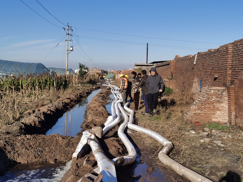 由于該村緊鄰象峪河,因河道水位持續(xù)高漲,村內(nèi)積水無法自然排出,導(dǎo)致近98萬平方米耕地被淹,總積水量約為60萬立方米。搶險突擊隊以里旺村小區(qū)西側(cè)耕地最低點為起點,呈樹枝狀布置水泵,以村莊東處的象峪河為排水末端,通過最低點水泵提升、中端水泵轉(zhuǎn)輸、末端水泵強(qiáng)排的三級聯(lián)排,并利用地形高差、開溝槽下管引流等方式降低耕地整體水位。經(jīng)過六天的晝夜奮戰(zhàn),截止10月18日晚,抽排積水約17萬立方米,積水面消退約15萬平方米,疏導(dǎo)退水渠約1400米。