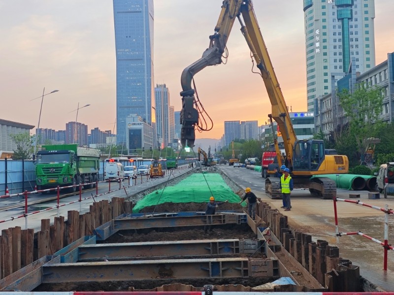 “追求精細(xì)極致,鑄就基坑支護(hù)的穩(wěn)固防線”。項(xiàng)目部將鋼板樁施打質(zhì)量視為確?;影踩c質(zhì)量的關(guān)鍵環(huán)節(jié),嚴(yán)格執(zhí)行材料準(zhǔn)入制度,所有進(jìn)場(chǎng)鋼板樁均經(jīng)過材質(zhì)證明核查、尺寸精度測(cè)量和外觀質(zhì)量檢驗(yàn)三重把關(guān),確保樁身無裂紋、無銹蝕等質(zhì)量缺陷,從源頭上杜絕不合格材料。施工中,施工人員采用全站儀進(jìn)行動(dòng)態(tài)監(jiān)測(cè),嚴(yán)格控制樁身垂直度偏差在規(guī)定范圍內(nèi),詳細(xì)記錄每根樁的打入深度、貫入度等關(guān)鍵參數(shù)。拔樁階段采用專用施工設(shè)備,按照“先支后拆、分段拔除”的原則有序進(jìn)行,拔樁后出現(xiàn)的孔隙立即灌砂,最大限度減少對(duì)周邊土體的擾動(dòng),實(shí)現(xiàn)平穩(wěn)施工與環(huán)境保護(hù)的和諧統(tǒng)一。