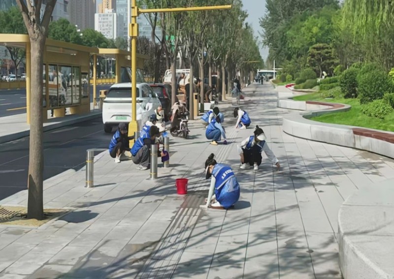 活動(dòng)自9月4日起為期六天,覆蓋迎澤大街(西段)全線,重點(diǎn)圍繞附屬設(shè)施清潔與道路精細(xì)化維護(hù)展開(kāi)?;顒?dòng)中,身著統(tǒng)一藍(lán)色“太原市政集團(tuán)”馬甲的志愿者們,手持長(zhǎng)柄擦洗器、水桶、抹布、鏟刀、掃帚等工具,對(duì)道路兩側(cè)公交站臺(tái)、路燈基地、護(hù)欄、照明燈桿等設(shè)施進(jìn)行系統(tǒng)清理與擦洗;同步推進(jìn)地磚灌縫精細(xì)化維護(hù)作業(yè),通過(guò)專(zhuān)業(yè)操作,確保每一條裂縫都“嚴(yán)絲合縫”,有效提升路面耐用性與通行舒適度,以實(shí)際行動(dòng)為市民出行安全與舒適保駕護(hù)航;同時(shí),志愿者專(zhuān)門(mén)對(duì)道路沿線的石頭字景觀展開(kāi)描金作業(yè),細(xì)刷蘸取金色涂料,一筆一畫(huà)精心描摹,成為主干道上一道兼具文化氣息與視覺(jué)美感的獨(dú)特風(fēng)景。