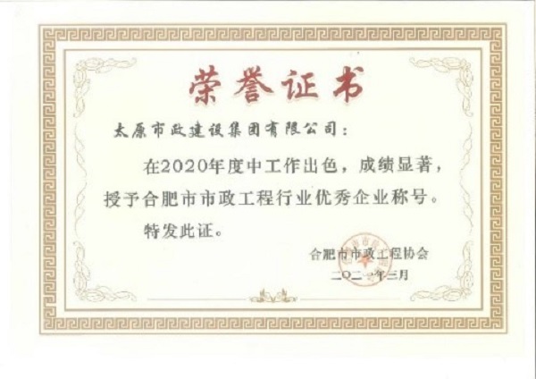 3月,集團公司榮獲合肥市市政工程協會頒發(fā)的2020年度“合肥市市政工程行業(yè)優(yōu)秀企業(yè)”榮譽稱號。張晉虎、王東根榮獲2020年度“合肥市市政工程行業(yè)優(yōu)秀項目經理”榮譽稱號。