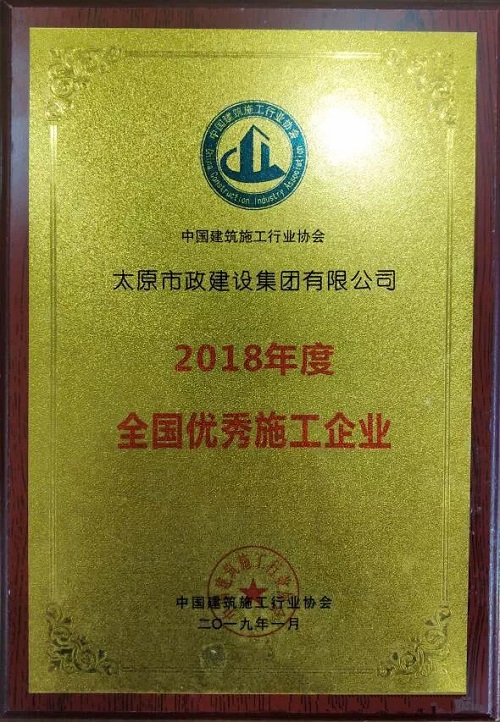 太原市政建設(shè)集團(tuán)有限公司榮獲“2018年度全國(guó)優(yōu)秀施工企業(yè)”榮譽(yù)稱號(hào)