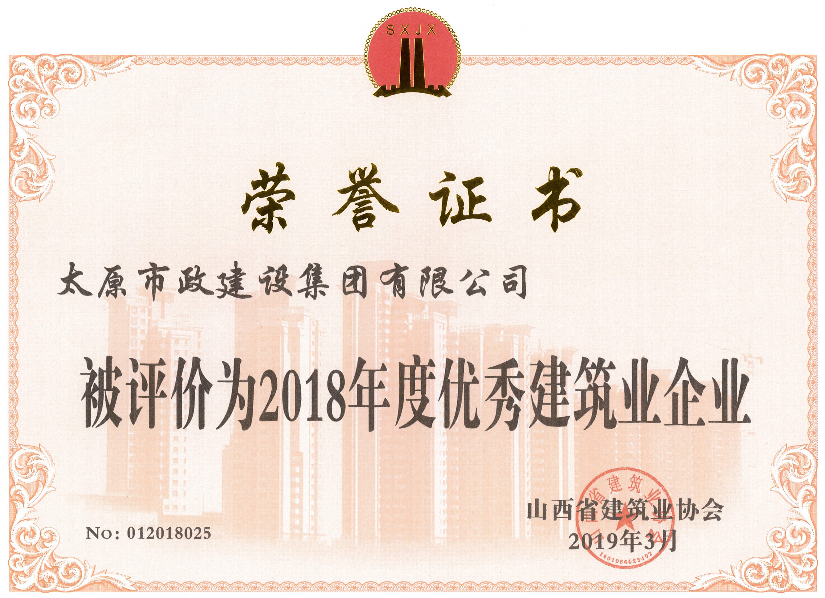 4月19日,太原市政建設(shè)集團(tuán)有限公司被山西省建筑業(yè)協(xié)會評價(jià)為2018年度建筑業(yè)企業(yè)優(yōu)秀等級。