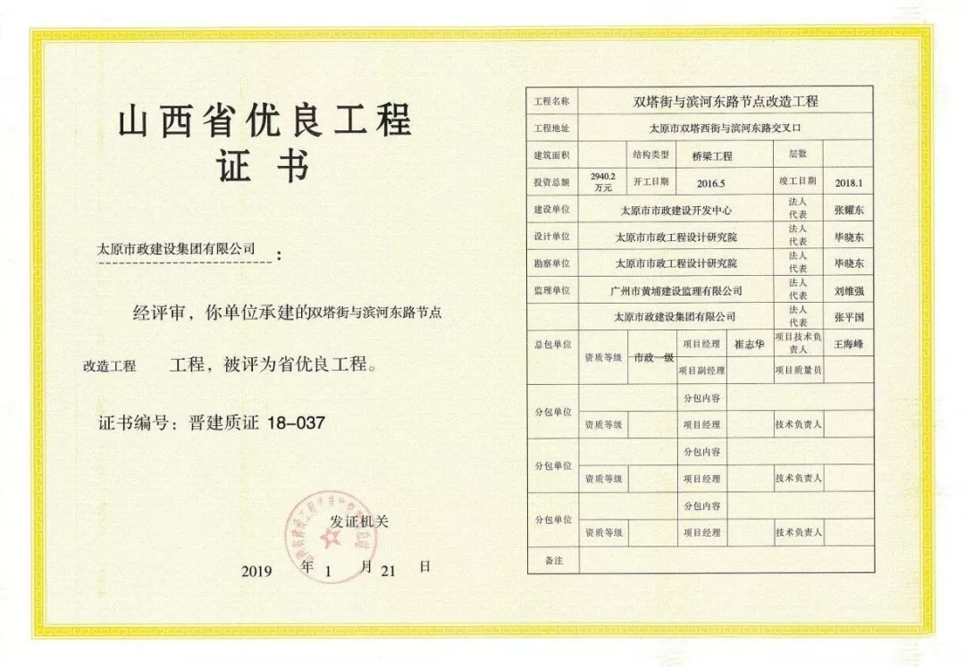 5月8日,太原市政建設(shè)集團(tuán)有限公司第八工程公司承建的雙塔街與濱河?xùn)|路節(jié)點改造工程榮獲“山西省優(yōu)良工程”榮譽稱號。