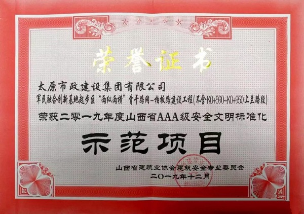 2019年12月25日,由集團(tuán)公司承建的“軍民融合創(chuàng)新基地起步區(qū)‘兩縱兩橫’骨干網(wǎng)絡(luò)—柏板路建設(shè)工程(不含K0+590-K0+950上蘭路段)”榮獲山西省建筑業(yè)協(xié)會(huì)建筑安全專(zhuān)業(yè)委員會(huì)頒發(fā)的“2019年度山西省AAA級(jí)安全文明標(biāo)準(zhǔn)化示范項(xiàng)目”榮譽(yù)稱(chēng)號(hào)。
