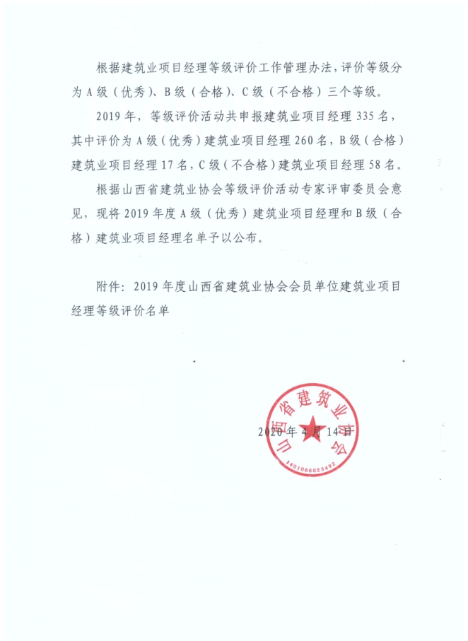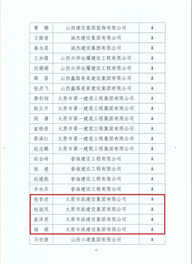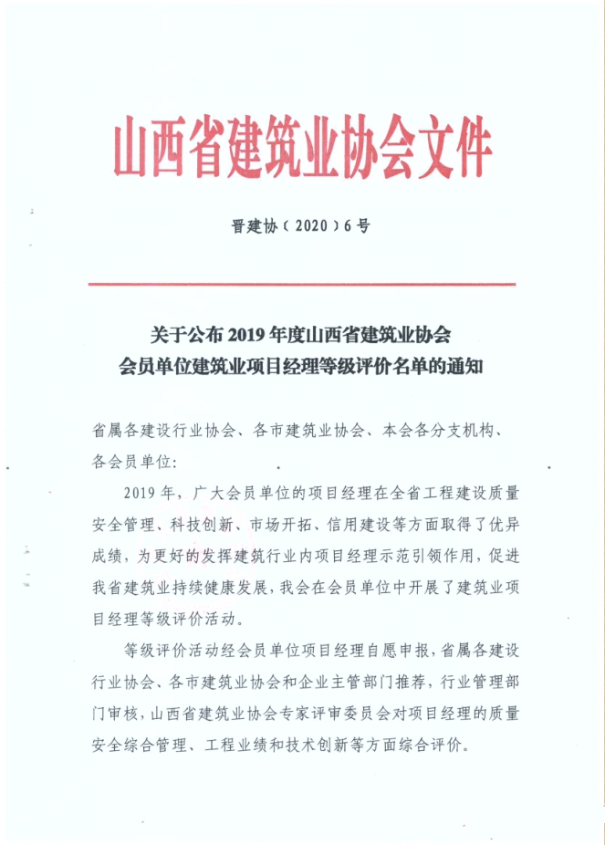 在“2019年度山西省建筑業(yè)協(xié)會會員單位建筑業(yè)項目經(jīng)理等級評價”評選結(jié)果中,集團公司張晉虎、趙淑鳳、崔澤英、楊娟被評為2019年度山西省建筑業(yè)A級(優(yōu)秀)項目經(jīng)理。