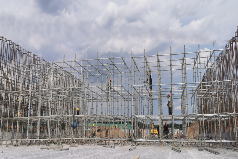 支架搭設(shè)提質(zhì)量 該工程在由東向西下穿東山過境高速公路的施工中,設(shè)計(jì)有1座長65米、寬33米、高8米,單孔跨徑為18米的四孔通道箱涵。依據(jù)國家相關(guān)規(guī)定,該通道施工屬于超過一定規(guī)模且危險(xiǎn)性較大的分部分項(xiàng)工程,需要組織專家對(duì)施工方案進(jìn)行論證。項(xiàng)目部提前謀劃,開工伊始責(zé)成相關(guān)技術(shù)人員制定專項(xiàng)方案,在六月中旬順利通過了專家論證,為后續(xù)施工奠定了堅(jiān)實(shí)基礎(chǔ)。針對(duì)該通道墻板厚、荷載大、支模架搭設(shè)跨度寬的情況,項(xiàng)目部按照規(guī)定要求,決定采用組裝快捷、使用方便、節(jié)省費(fèi)用、安全性達(dá)標(biāo)的盤扣式鋼管支架進(jìn)行打設(shè),確保高支?;炷翝仓踩€(wěn)定,有效保證了頂板支架搭設(shè)的施工安全。