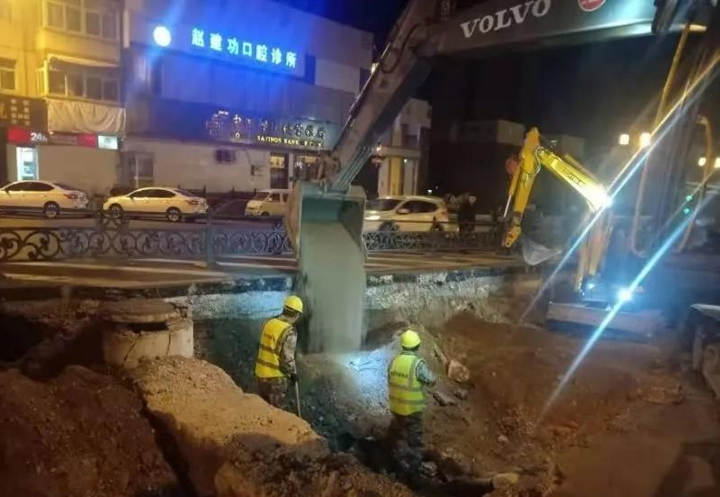6日晚11點,經(jīng)過60余名搶修人員的共同努力,塌陷路面基本破除,供水管道搶修順利完成,恢復居民日常生活供水。