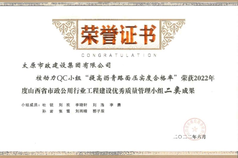 2022年度全國市政工程建設(shè)優(yōu)秀質(zhì)量管理小組三等獎_''核動力QC小組”提高瀝青路面壓實度合格率”