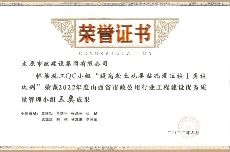 2022年度山西省市政公用行業(yè)工程建設(shè)優(yōu)秀質(zhì)量管理小組三類成果_橋梁施工QC小組“提高軟土地層鉆孔灌注樁I類樁比例”