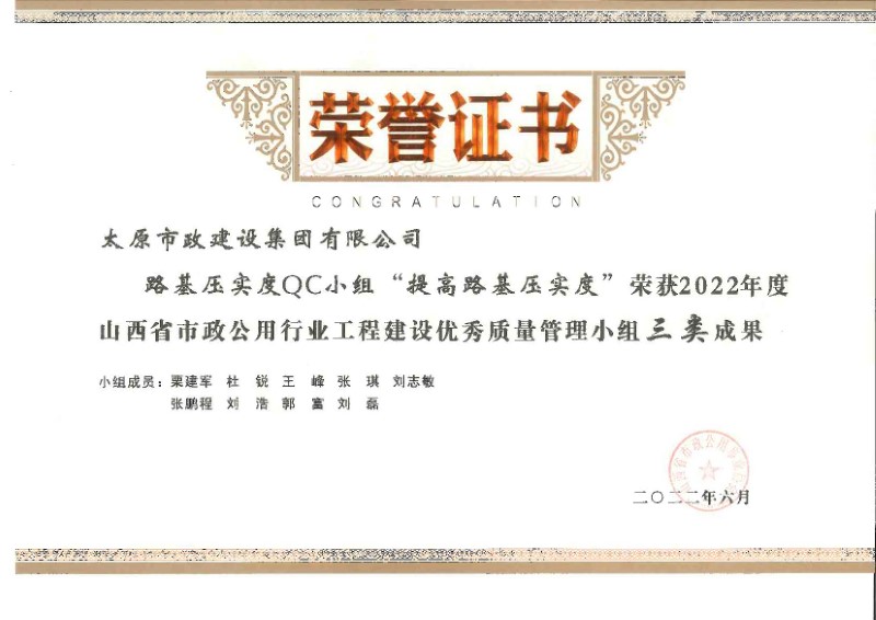 2022年度山西省市政公用行業(yè)工程建設(shè)優(yōu)秀質(zhì)量管理小組三類成果_路基壓實度QC小組“提高路基壓實度”